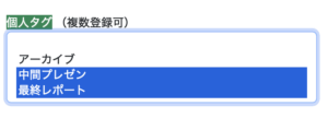 文献を整理する際、レフナビでは「タグ」を使うことができます。1つの文献に複数のタグをつけたい場合、たとえば「中間プレゼン」「最終レポート」の2つのタグを割り当てたいときは「CTRLキー(MacではCommandキー)」を押しながらクリックすることで選択可能です。